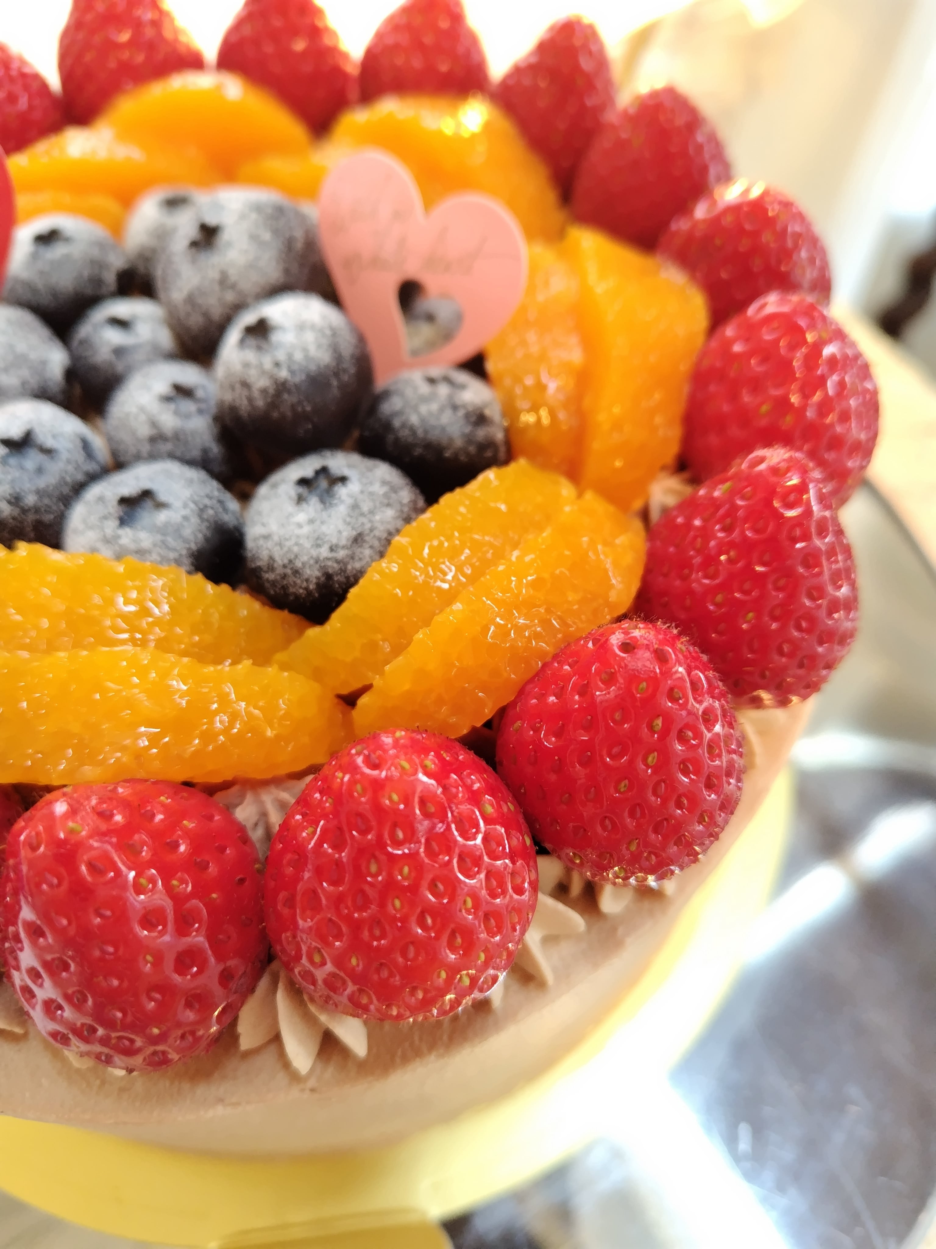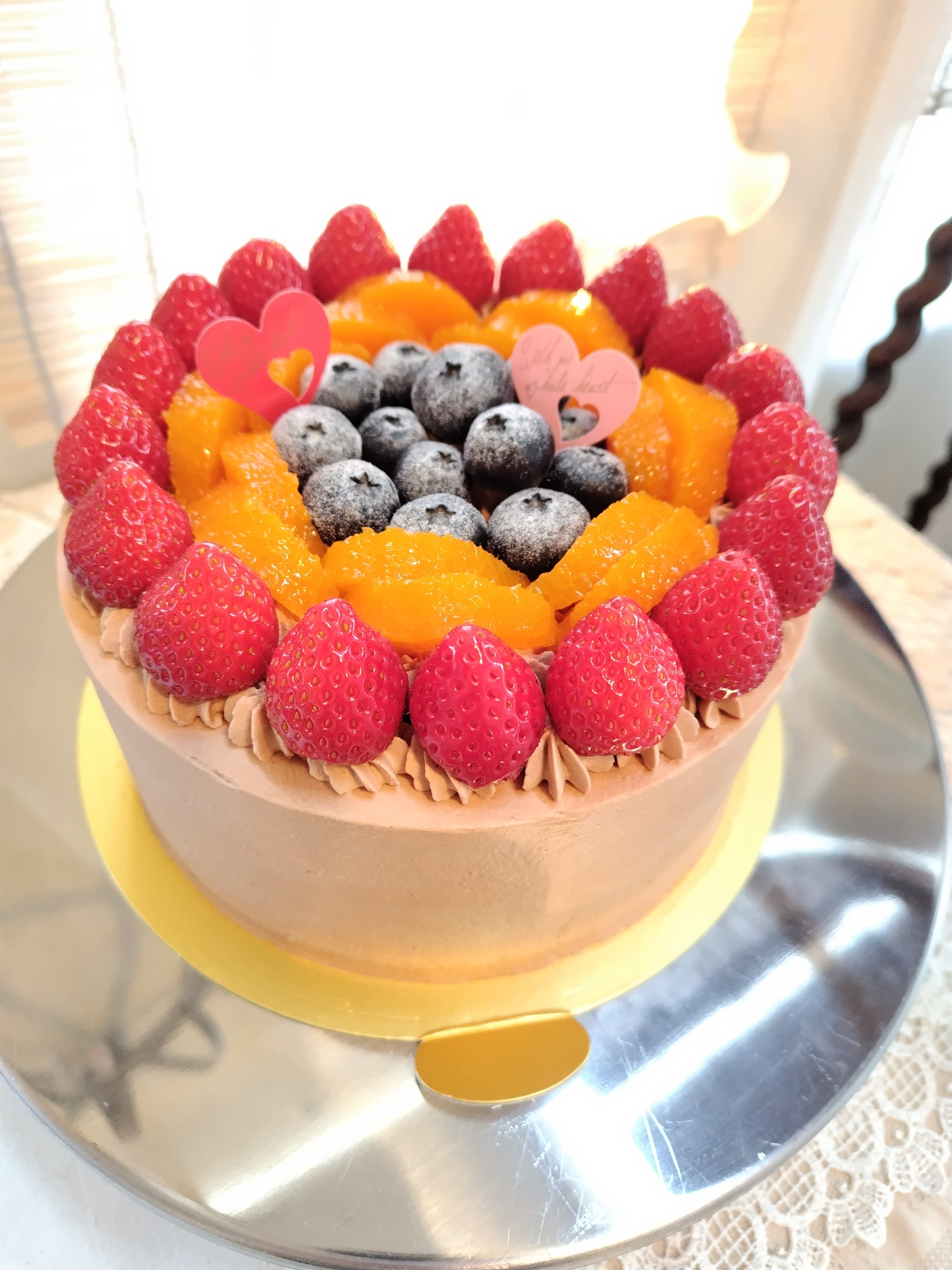 5枚のココアスポンジと5層のチョコレートクリームの土台の上に季節の果物を飾りました。